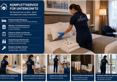 Rundum-Service für Hotels und Ferienwohnungen: Neben der klassischen Reinigung übernehmen wir auch Bettwäschewechsel, Nachkontrollen sowie die Vorbereitung für neue Gäste. So stellen wir sicher, dass Ihre Unterkunft jederzeit perfekt vorbereitet ist.